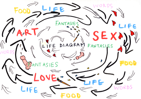 (Above: Love life sex art diagram by Zoe Catherine Kendall, pen on paper, 2011, artist’s own blog)