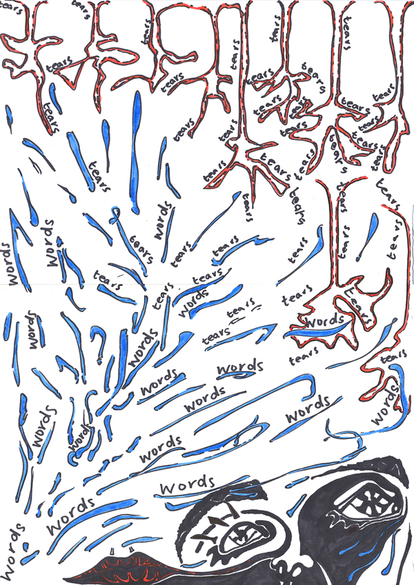 (Above: Words and tears diagram by Zoe Catherine Kendall, pen on paper, 2011, artist’s own blog)