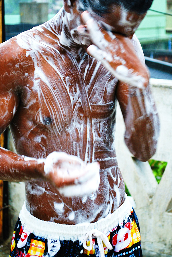 It was in 2009 Kolkata, India that I was to revisit my secret obsession. I was staying with a friend of mine who set up Shuktara, homes for abandoned deaf, disabled children and young people. As I had visited a few times, I had got to know them all quite well. One day I was summoned by the boys to join them, high upon the rooftop as the monsoons had started and the torrents of rain were now a sign of change. In the heat of the rains they washed themselves and each other, calling me to photograph them. It was a magical time watching as the soap suds created white tracks across their skin and tiny bubble flowers that hugged their beards and hair.