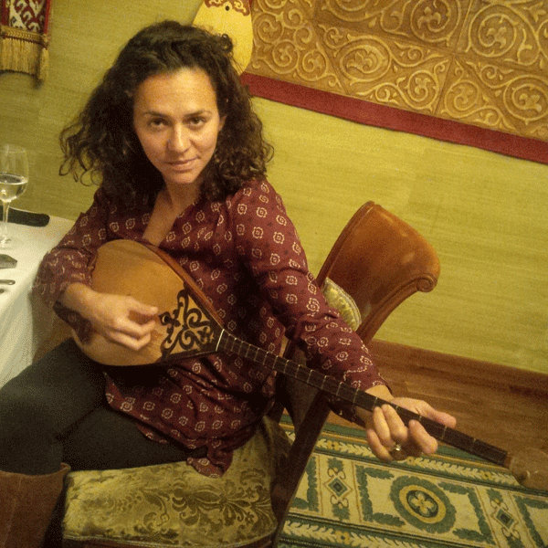 image: Josephine Burton playing the dombra in Almaty, Kazakhstan