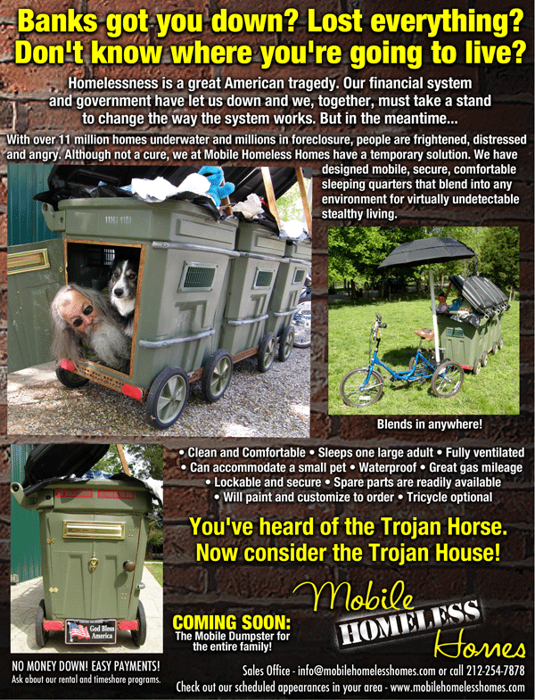 Joey Skaggs: One of the many I have in mind but haven’t done yet. I’m issue-oriented, so things tend to percolate and evolve. Ultimately, what I’m after is doing a prank that deals with issues, has broad appeal, has an embedded universal truth, has elements of plausibility, is provocative and perhaps controversial, has a life of it’s own, will be relevant for a long time, makes people think, give us all a laugh, and inspires someone to change a pre-conceived opinion. [Check out Joey’s The Solomon Project as an example].