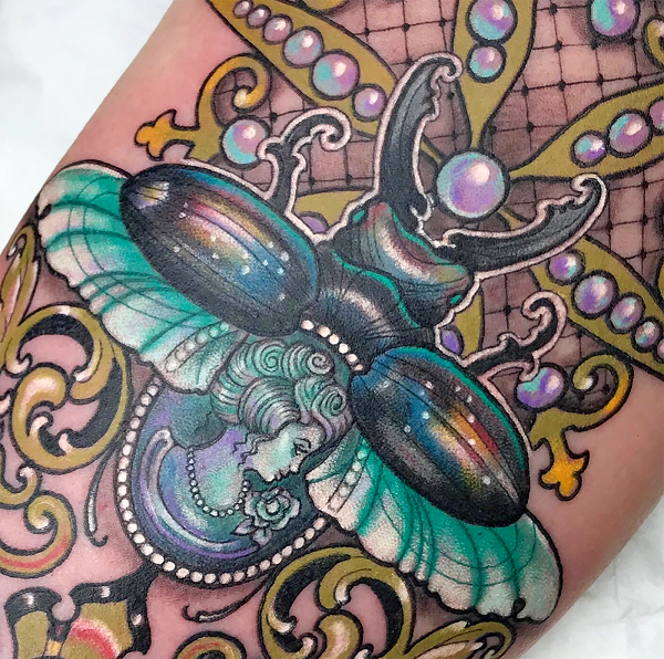 Her recent awards include Best Collaboration and Best Ornamental with Ryan ‘The Scientist’ Smith at the 2017 Cezanne Tattoo Convention in Aix-En-Provence and Third Best of Show at last year’s LTC for a collaboration with Ryan and Jay Freestyle which attracted big crowds, clamoring to see the masters at work.