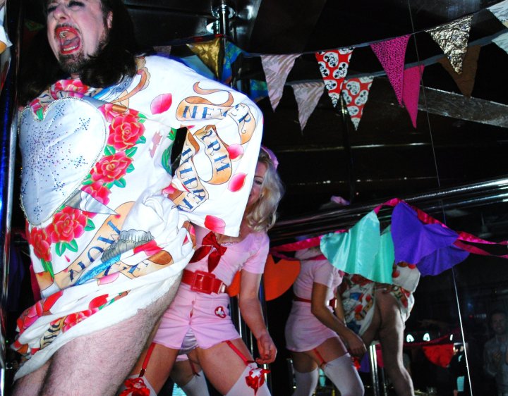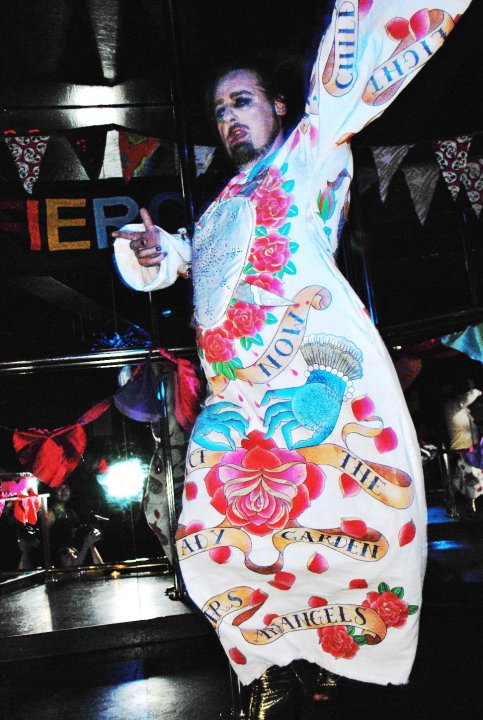 Mr Blueeyes himself was resplendent in an affirmation heavy white embroidered gown and took to the pole several times throughout the night in varying states of undress and underwent a costume change or two too. He ended the night in an all in one not-quite-see-through body suit. The other star turns on the pole were from the impossibly bendy Mr Dubois and Chiqui. The laws of nature were called into question more than once. Other highlights included “Goddess steel and her horses” which featured some most abrasive whip action and “Goddess bert and her bottom blushers” which saw some of the crowd come away with the souvenir of buttock wheels from Bert’s third hand. Tunes from The Bang Bang Club and The Men Who Fell To Earth were the backdrop of the evening and injected contemporary electro pop ands 80s disco classics into the night.