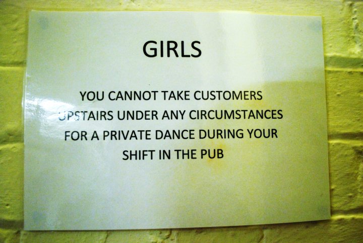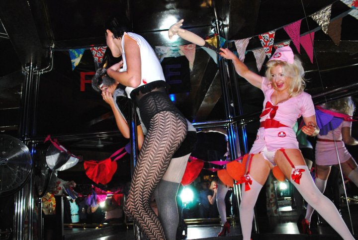 Welcome to GIRLS GIRLS GIRLS!, the House of Blueeyes London Fashion Week extravaganza and website launch, aboard Shoreditch’s pole-dancing haven The White Horse. This is no ordinary sartorial journey; last night’s ride was an antidote to fashion week. We were presented with the first taste of HOBE’s latest collection for SS2011 “I, Goddess” through a Warholian salon esq presentation with models periodically taking to the pole to showcase their wares –  a selection of largely monochrome bespoke t-shirts feauturing particular choice parts of the human anatomy and … lace.